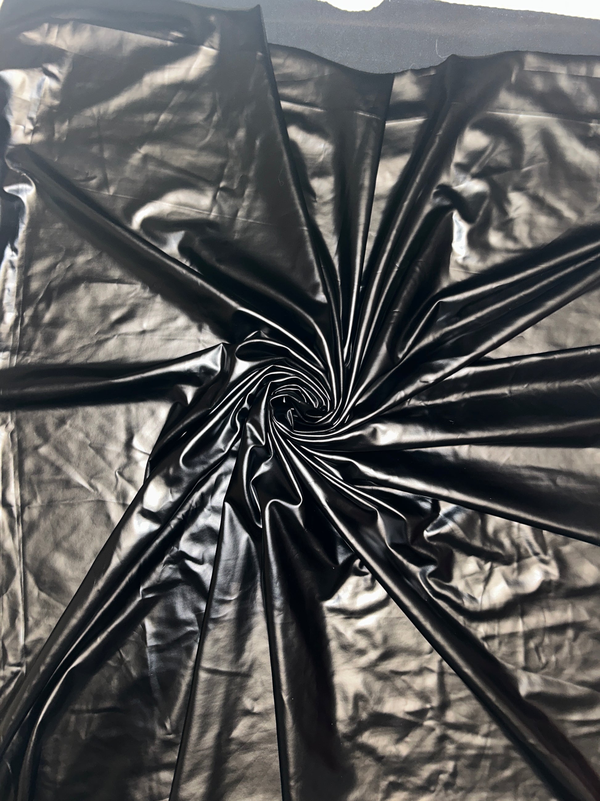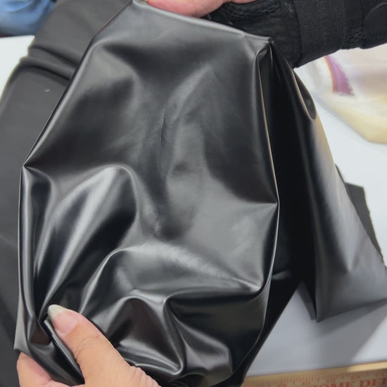 With a generous 58/60” width and true four-way stretch, this material delivers flexibility without sacrificing structure. The smooth faux leather finish provides a dramatic, polished look, while the 95% polyester / 5% spandex blend ensures durability, comfort, and strong recovery.